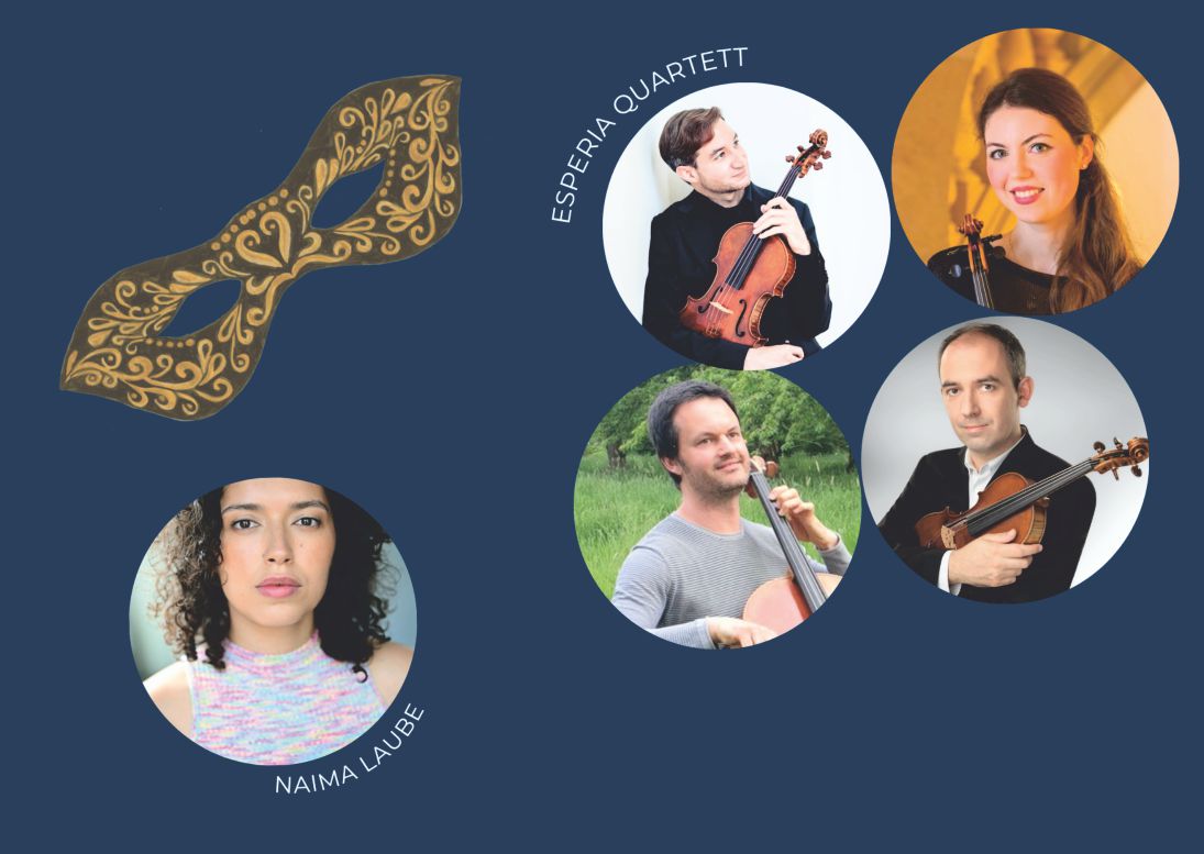 Das ESPERIA Quartett gestaltet mit der Berliner Schauspielerin Naima Laube einen Nachmittag mit einem humorvoll-raffinierten Streichquartett op. 20 Nr. 4 von Haydn, Dvoraks walzerseligem op. 54 und den Fünf Noveletten op. 35 von Glasunov, bei denen in flankierenden Texten von Wilhelm Busch bis Joachim Ringelnatz die Masken fallen.